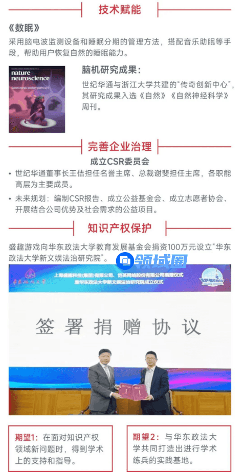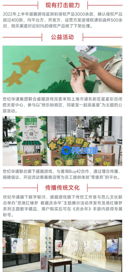 世纪华通在技术赋能、知识产权保护、完善企业治理等方面履行社会责任。技术赋能方面,企业履责成果较为直接地服务于社会公众,例如《数眠》有助于提升公众的睡眠质量,脑机研究也取得进展,两次入刊全球顶级科学杂志;知识产权保护方面,旗下IP“传奇”的价值、被侵权状况在国内均为典型代表,并带动企业高度关注知识产权保护,本年度企业在学术、产业示范层面继续推进;完善企业治理方面,世纪华通的社会责任布局更为系统化,CSR委员会在本年度成立。此外,世纪华通在公益、传统文化等领域也有成果产出,这也是重点且持续投入的领域,公益方面世纪华通每年均投入资源参加或组织活动,并带动旗下员工参与;传统文化方向世纪华通《庆余年》《传奇世界》等多款产品本身便具备中国文化内涵,世纪华通进一步结合数字藏品等热点推广模式,提升游戏用户对于传统文化的关注度。