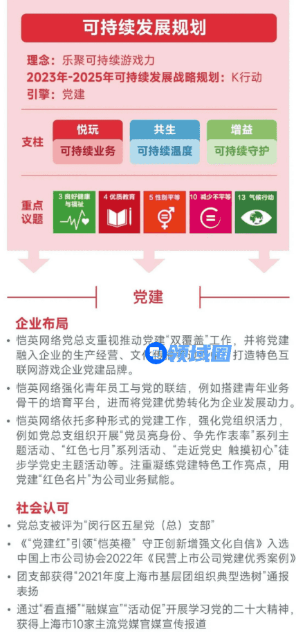 本年度,恺英网络的社会责任布局出现了较为明显的转型升级:一方面,企业将相对分散的履责事件梳理为更成体系的可持续发展规划,现阶段已发布可持续发展理念“乐聚可持续游戏力”,提出可持续发展行动“K行动”,并明确企业关注的重点议题,以及实现规划的支柱能力。另一方面,围绕上述规划,企业不断加码在细分领域的布局力度,党建方面,企业将党建作为履责引擎,组织开展“党员亮身份、争先作表率”“红色七月”“走近党史 触摸初心”等多项系列活动,现阶段已获得较多社会认可,例如恺英网络党总支被评为闵行区五星党总支、党建案例入选中上协2022年《民营上市公司党建优秀案例》;传播传统文化方面,企业依托文化产品深度还原中国文化并孵化原创IP,而在用户重视精品内容的文化产业发展趋势下,深度还原文化内容也有助于延长IP生命周期,进而成为企业依托IP履责的重要支点;公益方面,恺英网络布局较多,例如乡村教育、生态保护、灾难救助等,同时部分项目的布局时间较长,例如连续三年开展的 “云支教乡村小课堂”在线授课计划;“游戏+”方面,企业加码“游戏+医疗”,现有布局主要关注脑疾病患者的生命质量。