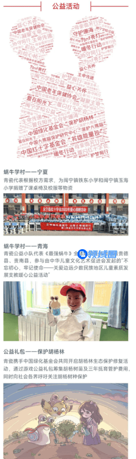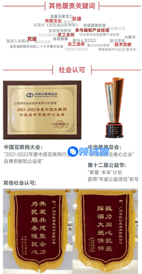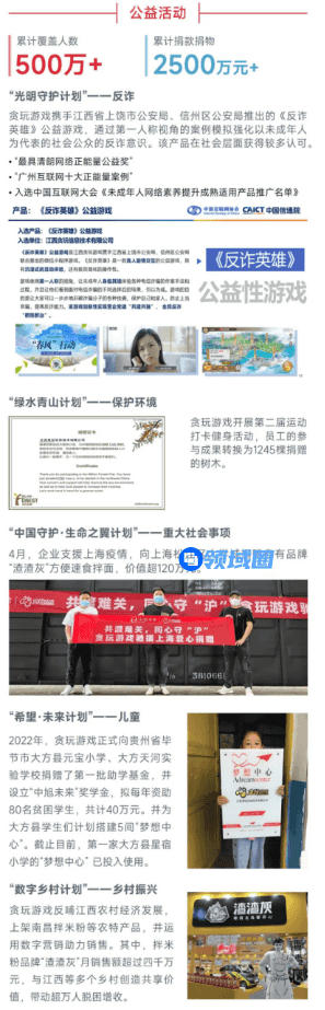 贪玩游戏从公益活动、传统文化传播等方面履行社会责任。其中,公益活动的履责成果最为突出,主要体现在两个方面,一方面,布局力度加码,本年度企业举办公益事件数量超30件,捐款捐物超800万元;另一方面,布局更成体系化,历史上已布局的助力儿童成长、支援贫困地区等领域,在本年度被梳理为更成体系的系列计划,企业的长期布局思路更为清晰。传播传统文化方面,本年度企业与非遗结合较密,并强化数字技术在其的运用。此外,员工关怀、党建等方面贪玩游戏的履责成果也较优,并获得多家社会机构认可。
