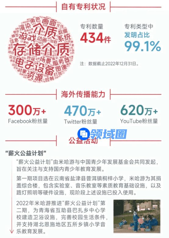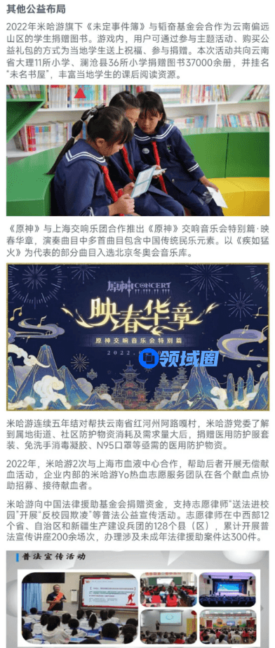 以技术创新为依托,米哈游实现了较为深入的社会责任布局,其背后是企业的长期技术投入,现阶段申请专利数量已超400件。凭借技术优势,米哈游旗下产品以高质量获取用户,例如依托于持续深耕的引擎技术,米哈游旗下产品能在移动端提供近似主机游戏的画面表现,并在移动端实现了开放世界这一创新玩法,进而全方位提升用户体验,对于中国游戏研发技术的提升起到了显著的推动作用。同时,米哈游也在持续探索单机/主机等高技术投入领域,未来有望进一步提升研发水准。在研发技术的支撑下,米哈游旗下产品也得以面向全球用户,进而更好传播中国文化内容。公益活动的成果产出也较多,本年度,米哈游一方面延续基于产品、系列计划的公益布局,例如开展《未定事件簿》的图书捐赠活动、基于《原神》音乐的传统文化传播活动、薪火公益计划第二期;另一方面强化对社会重要事件的关注力度,例如号召无偿献血、提供反校园欺凌法律服务。此外,米哈游在信息安全领域也持续推进。