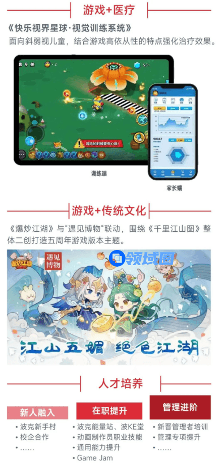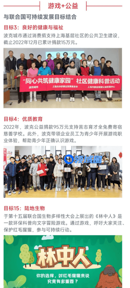 “游戏+”是波克城市履行社会责任的核心,围绕“游戏+”,企业在“游戏+公益”“游戏+党建”“游戏+医疗”等方面成果较为明显。“游戏+公益”方面,波克城市与联合国可持续发展目标结合较密,并以月度、年度报告等形式回顾;“游戏+党建”方面,波克城市设立专有办公室,既规划、推进长期党建项目,例如党建云平台、知识小程序,又关注实时需求,例如开发对接抗疫供需双方的互助平台;“游戏+医疗”方面,游戏化数字疗法产品《快乐视界星球·视觉训练系统》正式上线。此外,企业在“游戏+传统文化”、人才培养等领域也有成果产出,并继续拓展“游戏+”的结合领域与深度,这也有望带动企业挖掘更多社会价值,进而从更多维度践行社会责任。