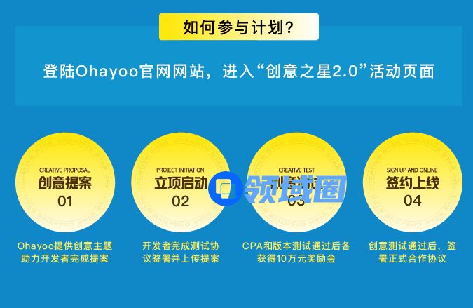 据介绍,参与该计划的开发者可直接使用Ohayoo提供的游戏创意,也可以用自己的创意,完成产品立项提案,当提案通过CPA和次留测试,开发者将各获得10万元奖励金,也就是说通过测试的开发者最高可获得奖励金20万元。