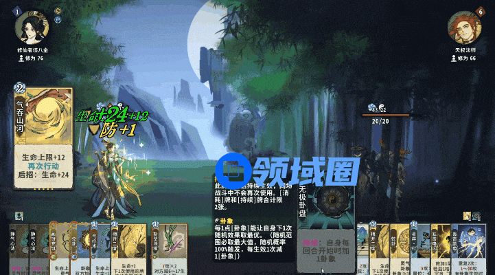 《弈仙牌》的玩法整套系统其实非常简单,玩家需要把随机从牌库中抽到的卡牌放入自己的行动栏,接着在战斗时就会依次发动这些卡牌上的效果,一局游戏中玩家需要与其他7人同台竞争,能活到最后的就能“得道成仙”(游戏胜利)。