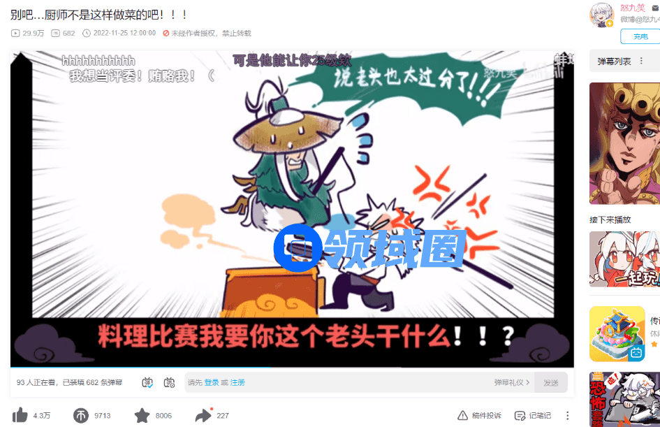 随后,更多知名内容创作者加入游戏二创行列。如B站手绘动画UP主@怒九笑 以游戏中的玩法和角色剧情为原型,创作了一场笑点十足的“合成料理大赛”。
