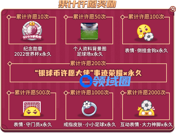 活动期间,花费银球币进行许愿,每次许愿需花费100银球币,并随机抽取一份特别奖励!根据您累计许愿的次数,领取限定表情、戒指皮肤等奖励!