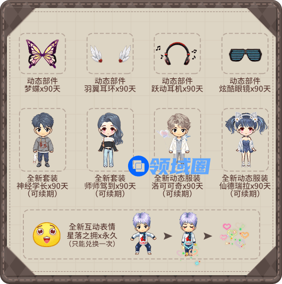 奖池中包含活动专属材料:甜甜豆!使用甜甜豆,可兑换特别礼物!包括全新服装:神经学长、师师驾到以及动态服装:洛可可奇、仙德瑞拉!