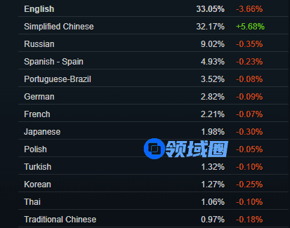 相比之下,更为普及的PC市场显然更加乐观。在今年10月,V社公布Steam平台最高在线人数突破3000万人,但是很多人可能不知道的是,使用中文的玩家占比早已超过了三分之一。虽然这并不代表近1000万的中文使用者都是来自国内玩家,但是毫无疑问的是,中国玩家在其中占了绝大多数。