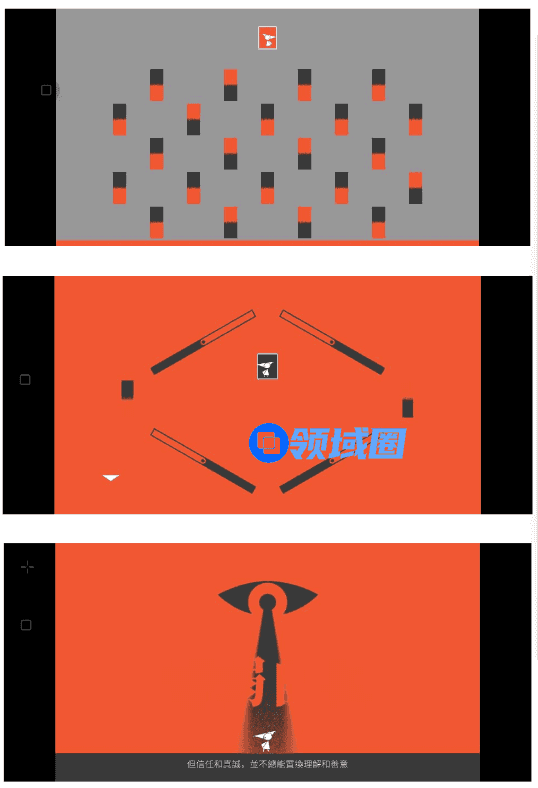 橙红与深黑的强烈配色,玩家每跳跃一次,可供立足的空中方块也随之变化。玩家则需要在这个高低起伏和颜色变幻的世界,伴随着循环往复的钢琴声,感受情绪的波荡起伏,寻找那个出口。