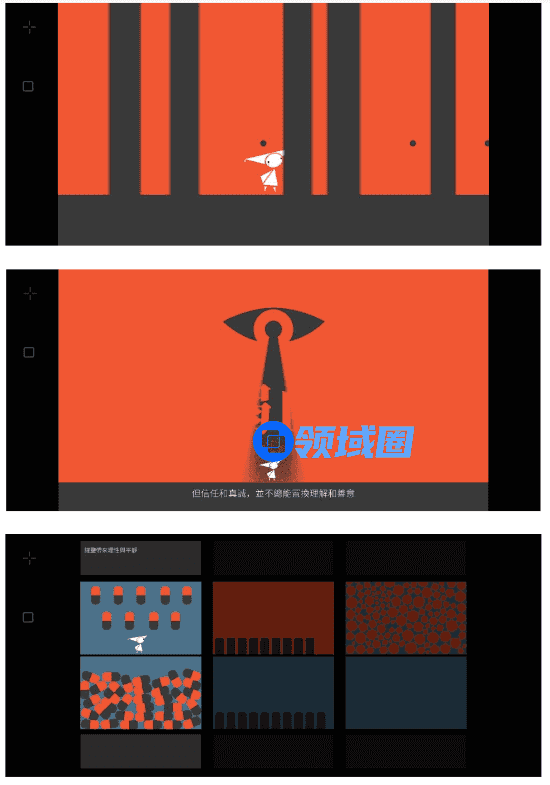 不少关卡的基础模件是在团队内的头脑风暴中讨论出来的。蔚然说,“从叙事和机制两头往中间走,就像跷跷板一样,在颜色变换的机制下,去找到平衡点和能够落地的想法”。因为制作时间和关卡容量有限,叙事剧情和演出都需要把控比重,他们只留下了“最想要表达的部分”。