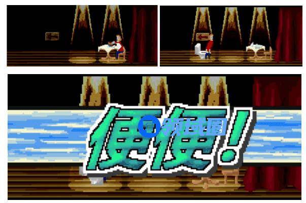 首先,像素哥从天而降,掉落至一个小房间。接着你将面临一颗炸弹,拾起后,左上角显示30秒倒计时,烘托出紧张气氛。这时面前亮起一盏聚光灯照在餐桌上,怎么,坐下来试试?于是主角坐下,拿出刀叉一口口吃下了炸弹?!接着一座马桶也适时亮起,怎么,坐上去试试?“咕咚”一声——世界居然就被拯救了?!看着像素哥被冲上云霄、掉落至一座城镇,《像素哥3》的正片也就开始。