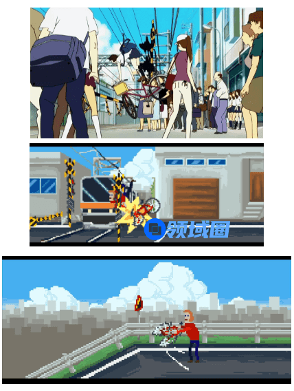 或许像素哥的不按常理出牌,能让《泰坦尼克号》的男女主都不必生离死别。比如他可能就想好了怎么改写《穿越时空的少女》里某个下坡路坏结局:为了不和即将经过的火车撞在一起,像素哥选择直接甩掉自行车。