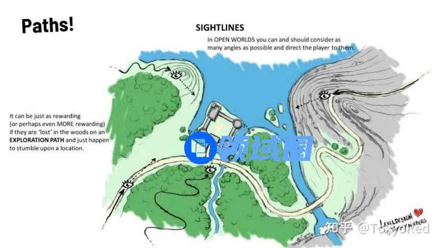 在开放世界中,游戏设计师应该考虑尽可能多的视线角度,并引导玩家前往这些观测点。