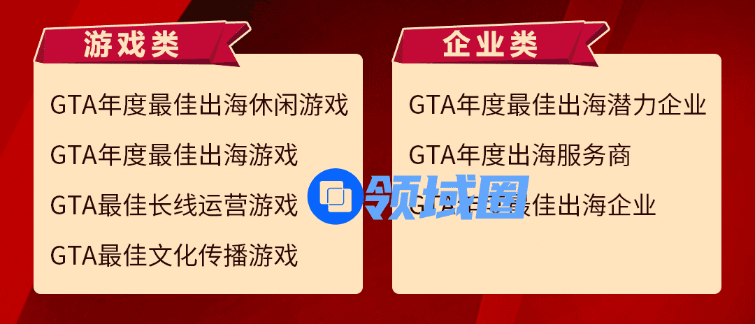 首先,GTA游戏出海峰会将在12月28日上午举办,由出海峰会高峰论坛、GTA出海颁奖盛典、GTA出海圆桌论坛三个环节构成。话题整体围绕行业出海风向来展开,将包含出海发行、渠道、投资、CP等多个行业热词,预计将覆盖欧洲,美洲,亚洲,中东等全球热门游戏出海地区。在这一环节,下设出海领域游戏类和企业类共7项大奖。