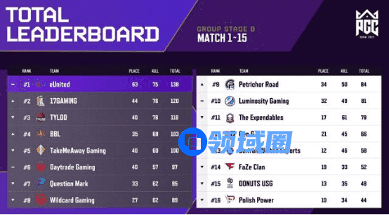 最终,17战队以76个淘汰数和120分跃居B组积分榜第二,TYLOO战队以78个淘汰数和118分排在第三,黑马TMA战队则是以60个淘汰数和100分排在第五的位置成功晋级下一阶段胜者组比赛;而备受瞩目的PeRo战队虽然在最后阶段完成反扑,打出单人9个淘汰的精彩表现,但由于前两天分差落后太大,以五分的微弱劣势跌入败者组。