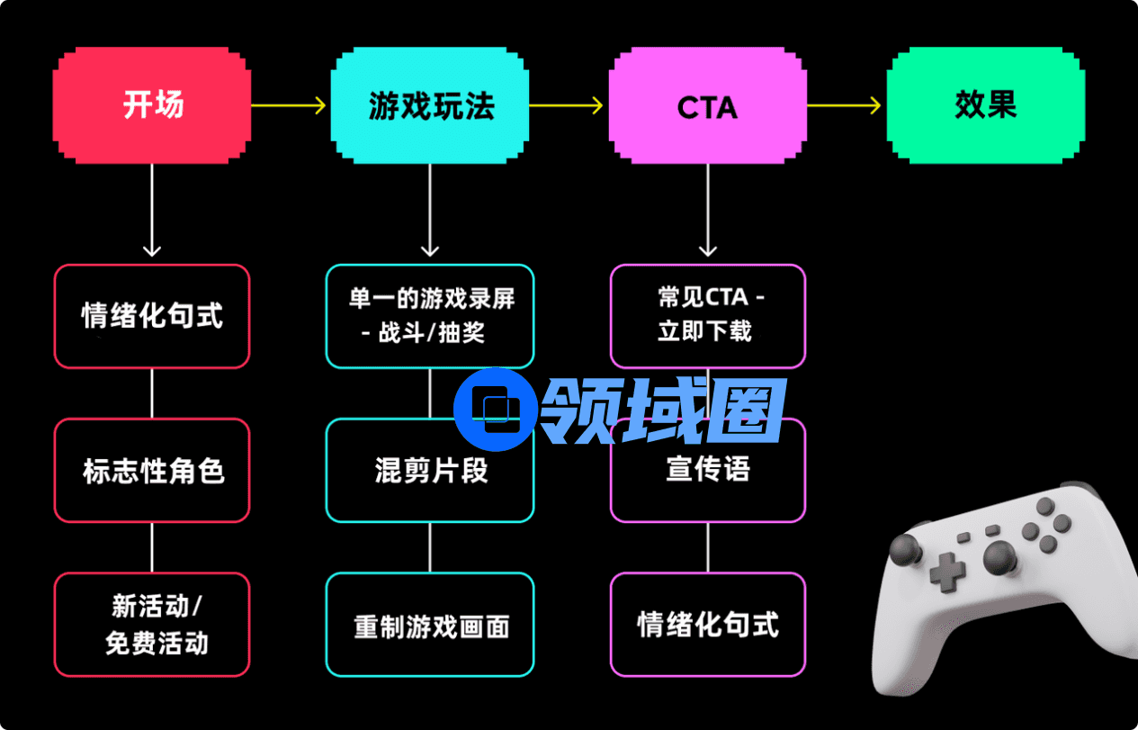 一个结构完整的脚本是创意素材的前提。通常而言,我们可以根据三个基本思路展开脚本的创作:开头引出主题抓住用户注意力,中间展示游戏卖点,结尾进行行动号召。