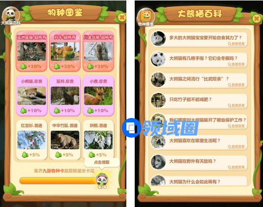乐元素每年都有科普公益活动,常做常新。以《开心消消乐》的“守护之旅”为例,为了让玩家眼前一亮,不仅在活动期间为每一个代表物种(大熊猫、雪豹、林麝、水獭)分别开设体验周关卡,保证充分体验每一个代表物种相关的奇幻生境。策划和美术团队“火力全开”、“绞尽脑汁”,科普创新在升级:首创完整大地图模式,打开活动页面,滑动手指即可看到国家公园的四季时令变化,可谓看尽四大代表物种的春夏秋冬;首创生境场景升级玩法,带玩家身临其境体验熊猫宝宝的竹林生态变化,还能看到熊猫进食的待机萌态。除此之外,科普也是“来真的”:收纳超过30张动植物罕见图片、70个科普趣味见闻及问答,俨然成为一部移动的“动植物科普小宝典”。