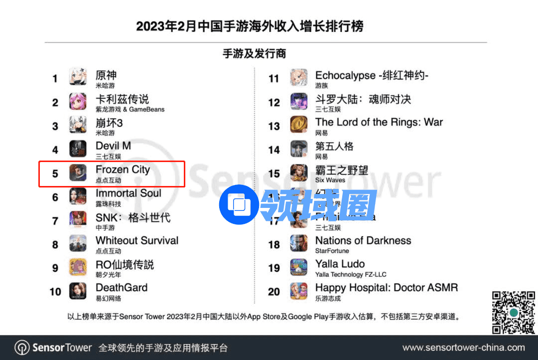 相较于国内市场的“摸索”,去年有点点互动凭借IP衍生游戏《Family Farm Adventure》(菲菲大冒险)在北美市场获得亮眼成绩,今年又有《Frozen City》(冰封时代)闯进2月海外收入增长榜前5。