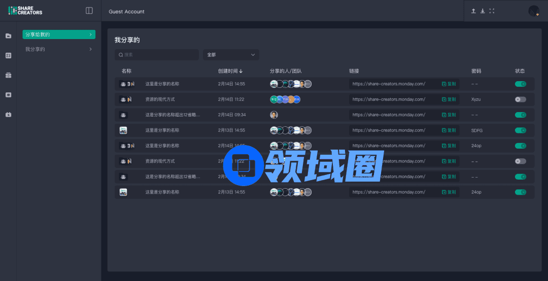 √分享资源的名称、分享时间、分享的人/团队、链接和密码等信息一目了然,通过状态按钮可随时对分享出的资源进行停用。