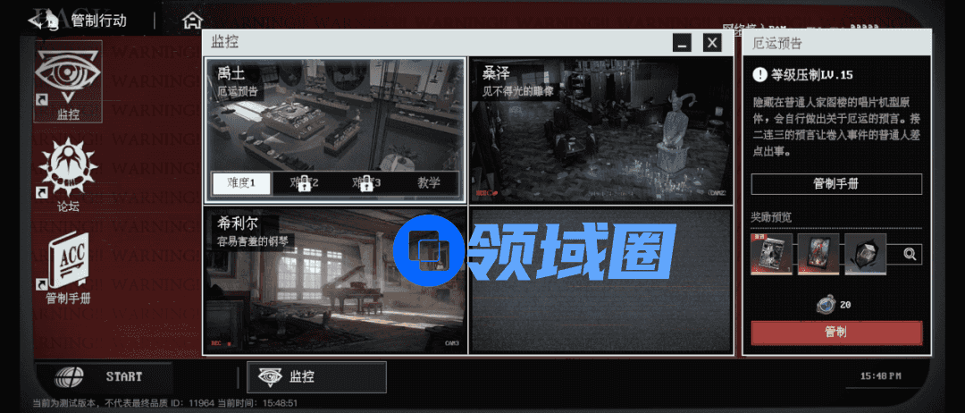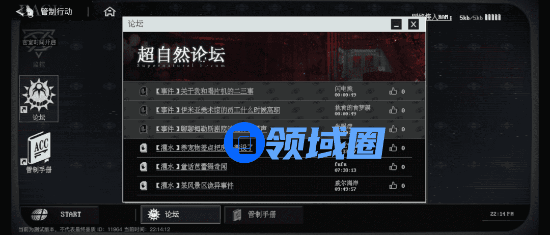 “管制行动”本质上是一个通过调查、交流获取信息解决事件的玩法。完成关卡后可以获得特别的奖励。但在正常的24小时里,玩家通过“管制行动”仅能够浏览超自然论坛和管制手册,发现可能的超自然现象与威胁,但真正想要解决这些威胁则需要进入那12个小时的密室时间。