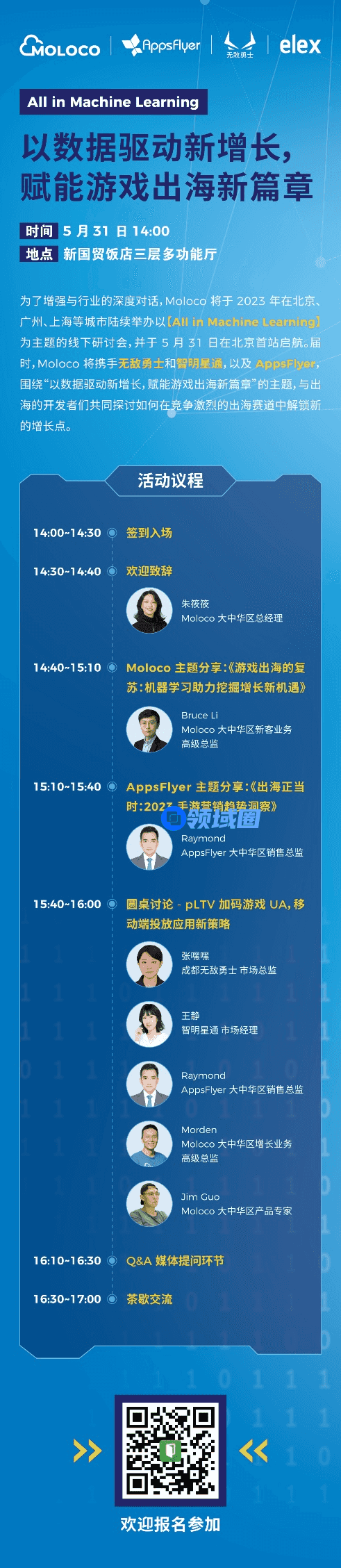 为了增强与行业的深度对话,Moloco 将于 2023 年在北京、广州、上海等城市陆续举办以【All in Machine Learning】为主题的线下研讨会,并于5 月 31 日在北京首站启航。届时,Moloco 将携手无敌勇士、智明星通和 AppsFlyer,围绕“以数据驱动新增长,赋能游戏出海新篇章”的主题,与出海的开发者们共同探讨如何在竞争激烈的出海赛道中解锁新的增长点。