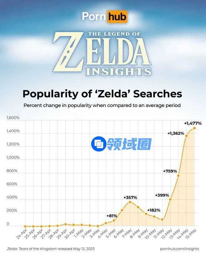根据P站官方数据显示,《王国之泪》在美国发售期间,网站的总流量下降了2.3%,而有意思的是,塞尔达相关的视频搜索量在发售当日却暴涨399%,到了5月15日这个数字达到了1477%。