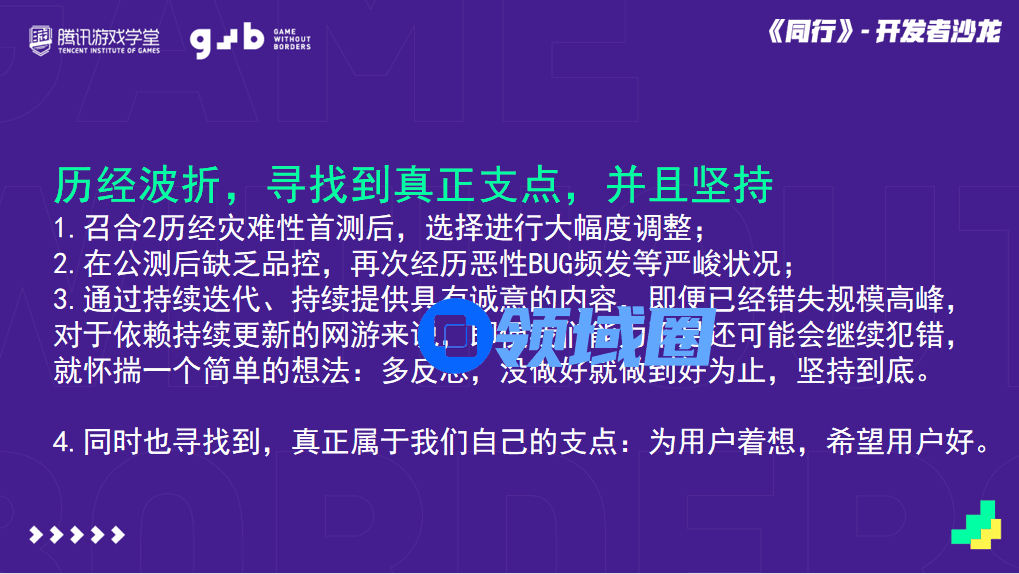 好了,以上就是我本次分享的全部内容了,希望这些经历和思考能对你有所帮助,其实说实话,我自己曾经也了解过许多失败案例,我天真的以为自己能避开,就像我们都知道用头撞墙会很痛,那到底会痛到什么程度呢?可能真的只有我们自己也撞过了墙,才会真正知道有多痛,或许这就是万事万物发展的规律,必然会踩坑必然会撞墙,我们能做的或许只有不断的鼓起勇气继续前行,找到支撑自己的支点,我有时候会反思,或许正是因为我们团队的支点是具备社会价值的,所以才能让我们在不断踩坑撞墙后,还能继续存活和发展,或许再稍微多思考一点点,我们游戏行业从业者,能为这个时代、能为年轻人们、能为处于煎熬状态下的人们,帮助到一些什么,提供一些什么呢?