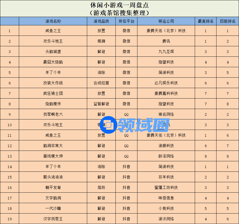 休闲新游周报每周统计微信小游戏、QQ小游戏、抖音小游戏、硬核小游戏以及App Store和Google Play上的新游爆款,并按照分类制作表格,将游戏排名情况等信息公布,希望给到行业同侪帮助。