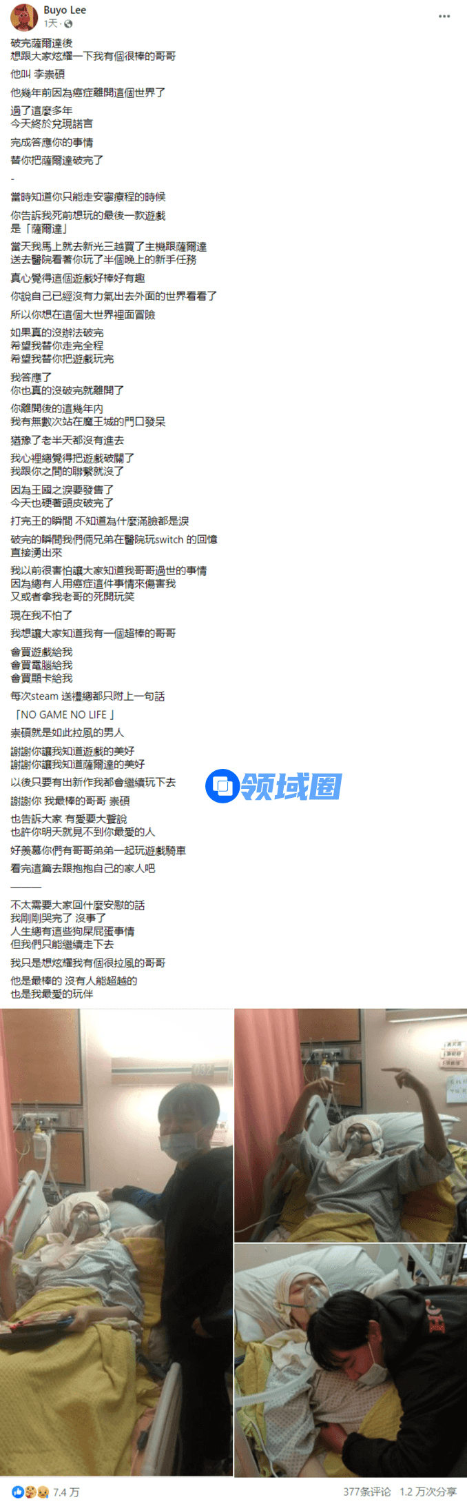 在几年前,网友哥哥因为癌症去世,留下了希望弟弟帮自己把《塞尔达传说》通关的遗愿,这几年时间,网友一直将这款游戏当做兄弟二人之间的最后联系,迟迟不愿意把游戏通关。直到最近,网友才终于含泪完成自己的诺言,并在网上发布了这篇长文,怀念感谢自己的哥哥,感叹“今天终于兑现诺言,完成答应你的事情,替你把塞尔达破完了”,字里行间流露出来的爱与思念,引起了全网共鸣与感动。