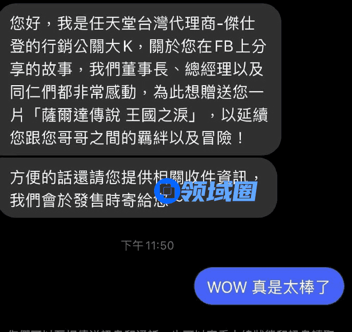 注意到这一事件后,中国台湾任天堂代理商杰仕登联系到了网友,并向其赠送了一份《塞尔达传说王国之泪》,以延续兄弟两人的羁绊和冒险。