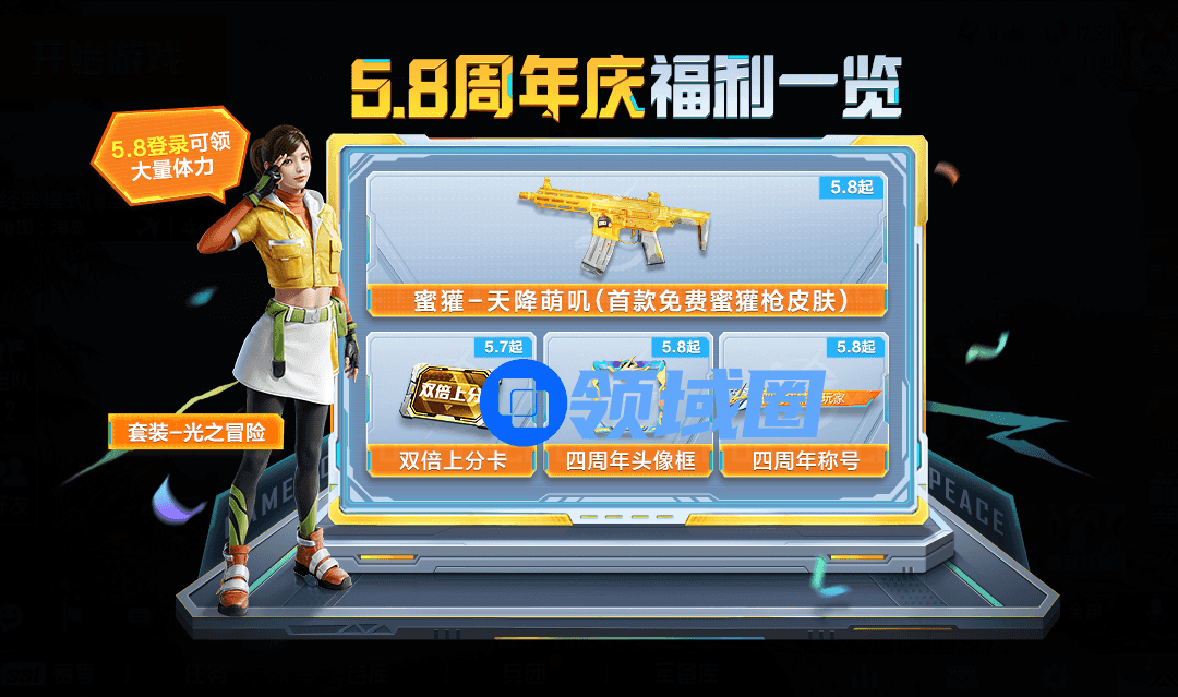 为了让特种兵们过一个更有仪式感和氛围感的四周年庆,《和平精英》在5月8日上线回忆活动。胜利女神宋茜引领特种兵们乘坐冒险列车,穿越时间和空间,回到2019年,回顾1-4周年场景,回望历年冒险生涯数据,奔赴新的冒险。参与活动即可领取“四周年精英玩家”称号,开启累计任务后,还能获得蜜獾枪皮等福利!