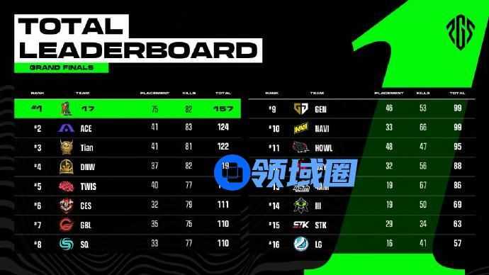 来到决赛,17战队凭借着磅礴的士气一往无前,在首日就吃下一鸡冲至积分第三,第二日凭借高额淘汰数暂居榜首,并在第三日稳扎稳打拿取排名分且于最后一局吃鸡完美谢幕夺得冠军!Tianba战队在LongSkr选手和PaoPao选手的支撑下,多次于决赛和对手战斗到决赛圈,同时凭借着极强的机会把握能力在最后关头成功吃鸡,夺得本次PGS1季军的荣誉;4AM战队尽管有着不错的单局得分能力,但是缩圈的运气似乎不在他们这一边,这也让他们无法很好的取得分数,最终排在第十三名的位置。