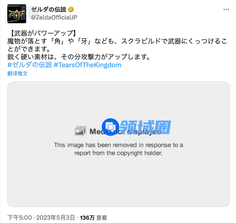 任天堂要求 Twitter 删除涉嫌侵权《塞尔达传说 王国之泪》的图片,可没想到大水冲了龙王庙,《塞尔达传说》官推发布的宣传图片也被认定为侵权而遭到删除。该图片发布于5月3日,目前仍未被恢复。