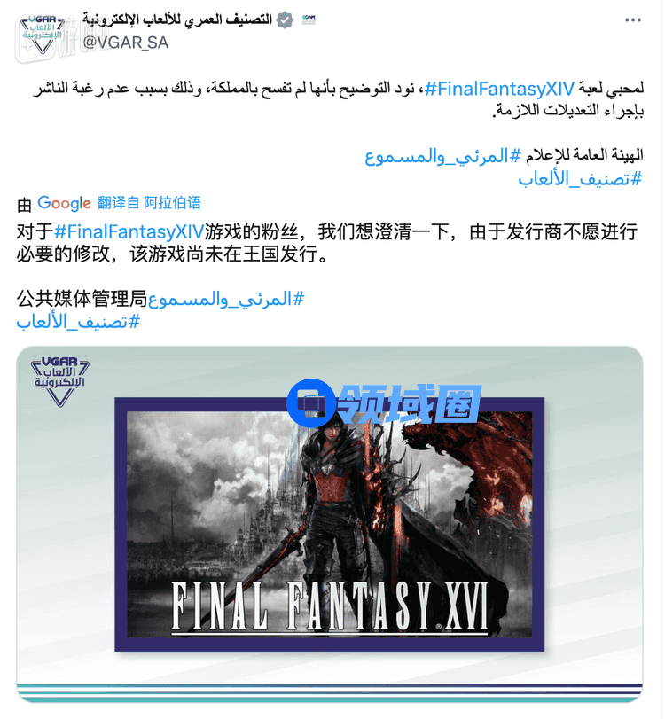 《最终幻想16》被禁止在沙特阿拉伯发售。审核机构解释称,SE不愿意对游戏进行必要的修改,导致游戏未能过审。
