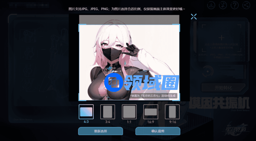 进入到“模因共振机”之后,玩家就可以上传图片并转化成各种形式的“三月七”。值得一提的是,上传图片之后系统会根据图片尺寸自动选择当前最合适的比例,同时还提供了额外几种剪裁尺寸供玩家选择。
