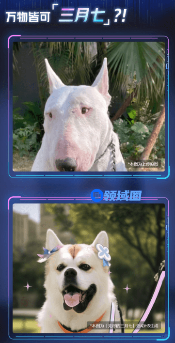 最后,我还发现了2个极其有意思的小彩蛋。如果上传的是猫猫狗狗的宠物图片,AIGC只会重构图片,并为其增添一些诸如三月七四叶草之类的小装饰。