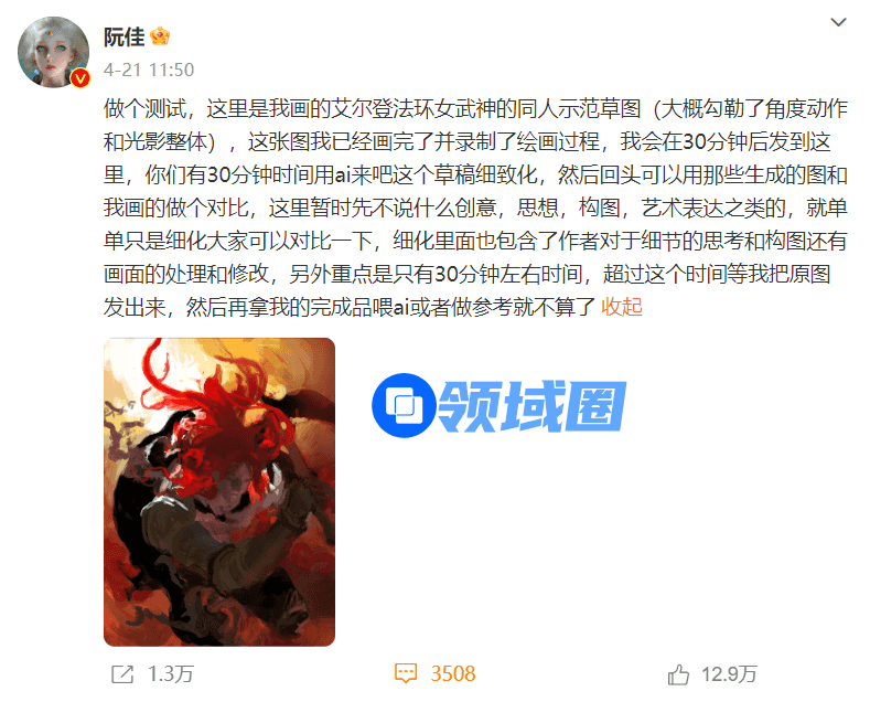 4月21日,知名CG画师阮佳发布微博,向AI发起正面挑战,让大家使用AI在30分钟之内对他提供的草图进行细化,然后来与他的完稿进行对比。