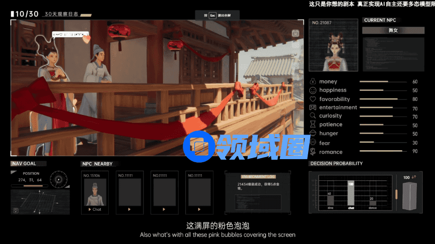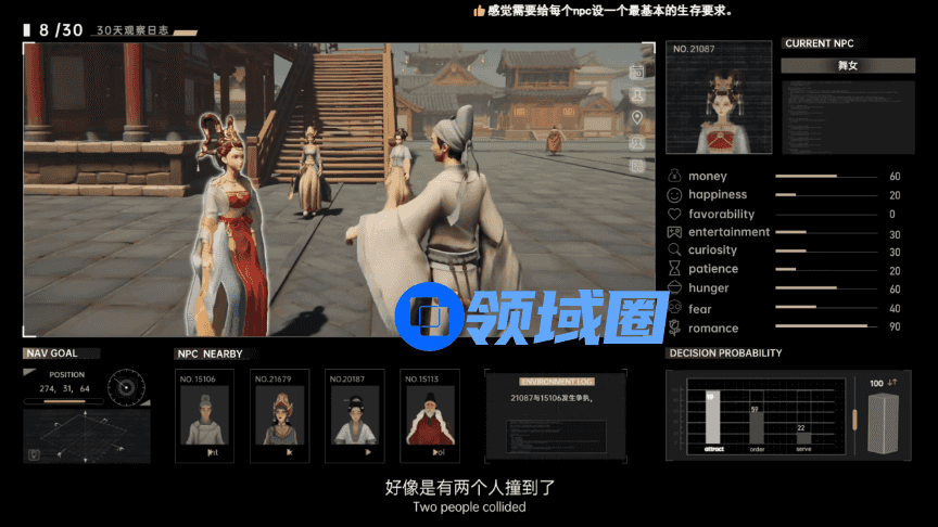 在《活生生的长安城》中,舞女对书生有了好感,游戏画面最直观的表现就是像R18游戏一样让舞女身上冒爱心,那么,它的AI是否只能理解用“冒爱心”这一种形式来表达舞女的好感度上升?舞女是否能理解中国古代女性独特的娇羞感并表现出相应的动作?她是否也能像一些恋爱小说里的女性一样,对自己的感情有着类似于“别扭”“傲娇”一样的表现?如果不能,那她与大厂靠人工堆出来的NPC区别在哪里?