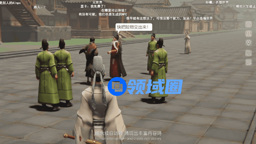 但视频的内容却让我比较失望,视频时长4分02秒,主要内容是:制作者创造出了一个虚拟长安城空间,并生成了大量的NPC,声称使用AI为这些NPC赋予了灵魂,然后向观众展示了NPC们的日常生活——看上去像是有着自主意识的人在自发地与其他NPC进行交互,并且,开发者表示:每个NPC都有着独一无二的设定。