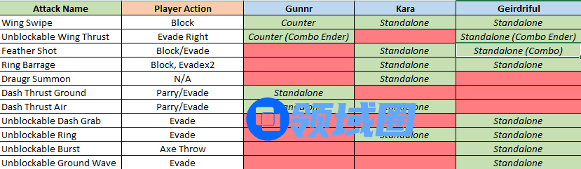Gunnr(女武神)有2个独立攻击,其作用是鼓励闪避招架(黄色FX);他们的预期窗口/攻击速度相似,以允许一致的闪避时间。[它]鼓励玩家招架闪避,但并不强制。Gunnr的所有攻击都可以在一系列初始攻击后进行左/右/后躲避或招架[除了]1次不可招架(红色)攻击[...],因此玩家有足够的时间准备。不可阻挡的攻击几乎没有跟踪,因此玩家可以以最小的精度向右躲避。