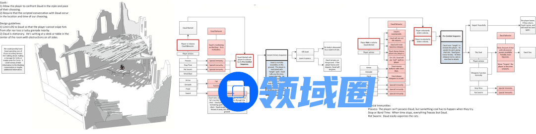 Nightingale的原始设计文件(下图)概述了遭遇战需明确设计目标,以证明异常封闭的竞技场布局是合理的。此外,由于《耻辱》是一款具有多种不同玩家能力的“沉浸式模拟”RPG游戏,因此她使用流程图格式来想象不同的玩家策略,以及遭遇战脚本应如何优雅地处理边缘情况。然而,正如她指出的那样,阅读的内容相当多;在设计摘要中写入太多细节并不一定能改善规划或设计。