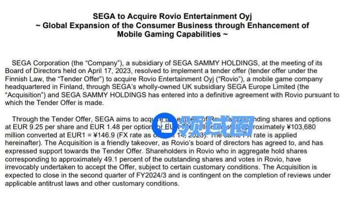 近日,世嘉正式宣发将以7.76亿美元的价格收购知名手游《愤怒的小鸟》开发商Rovio工作室,本次收购预计将在本财年第二季度完成。