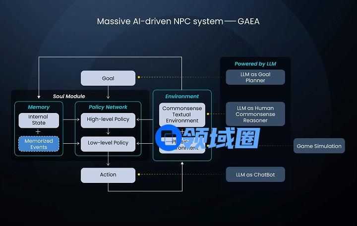 在第二阶段时,张弛所在团队为GAEA多个模块引入了LLM的能力,比如利用LLM做AI NPC角色的目标规划,以及协助环境系统进行常识推理,并将其与自主研发的Chatbot相结合,进一步提升NPC的对话技能。