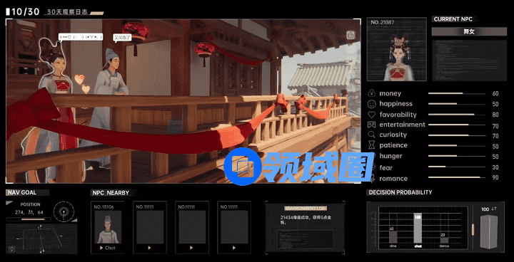 而灵魂系统负责给AI NPC设定角色、性格、目标,并记录AI NPC在虚拟场景中生活发生的各种事件,让AI NPC根据内在动机和外部环境的变化来采取行动,做出符合自身逻辑的行为选择,从而产生丰富多样的故事线。张弛解释说,“有了灵魂系统,舞女去跳舞还是约会,由她自己决定。“