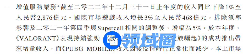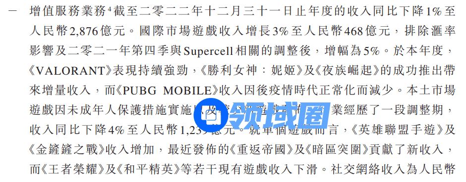 鹅厂2021年本土游戏收益同比增长6%,财报中提及的大头依然是《王者荣耀》《使命召唤手游》及《天涯明月刀》;而2022年虽然由于未成年人政策的调整使得部分游戏收入下降,但《英雄联盟手游》和《金铲铲之战》又挑起了大梁,因此整体收益波动并不明显,本土收益同比下降仅4%,来到1239亿人民币。
