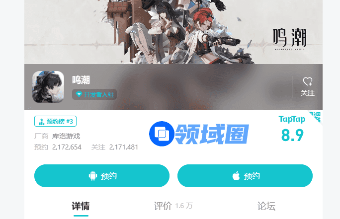 除了上文提到的游戏公国,库洛也是一家实力强劲的开发商,目前在研作品《鸣潮》,是一款开放世界游戏,不少人认为这是一个能够对标《原神》的产品,而游戏的测试表现也比较出色,并长期稳定在TapTap预约榜前三名,预约数目前已超过210万,评分也有8.9分的高分。