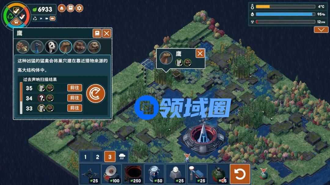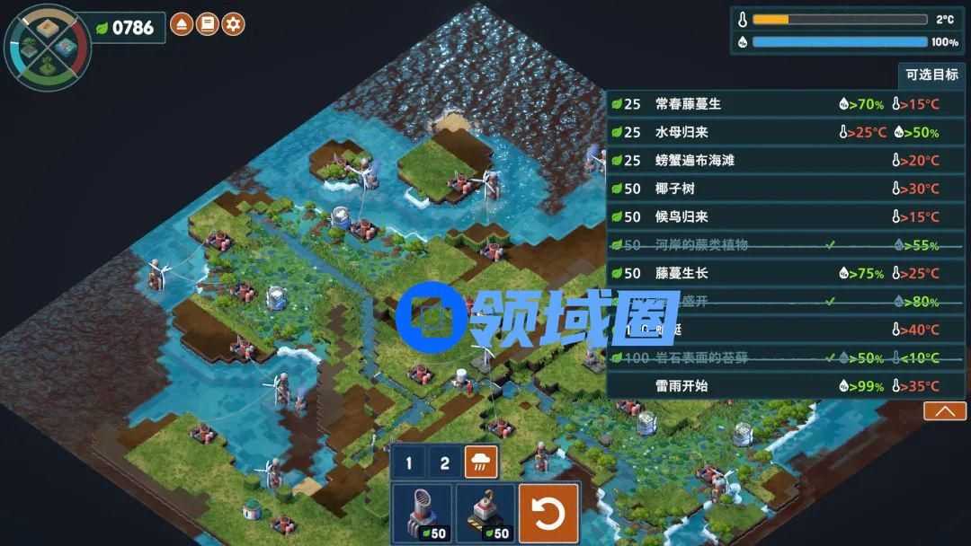 后期温度和湿度的加入,不仅让游戏拥有更多资源获得途径,也为游戏目标的达成加入更多影响变量。如果要增加云雨,用人工增雨机仅需要消耗资源,但要提高温度,使用燃烧器则要千万小心火烧燎原,用速冻机降低温度时同样会减少植被,一不注意会让已达成目标的植被数量功亏一篑。尤其当温度湿度已经超过植被生长适合条件,则很可能需要开局重来。