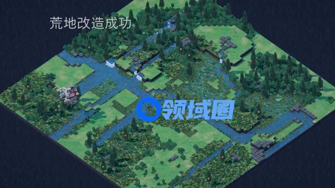 有了植被河流,还少了动物撒欢。搭建好观察台,根据文字提示,点击不同属性的地块扫描动物。于是在湿地里出现了青蛙,草原上又多了悠闲的小鹿。到了这里,总算到了最后一步:回收。音乐也应景地变得欢快起来,用无人机顺着河流回收现代机器,不妨用上三倍速,为游戏增添一段酣畅淋漓的收尾旋律。