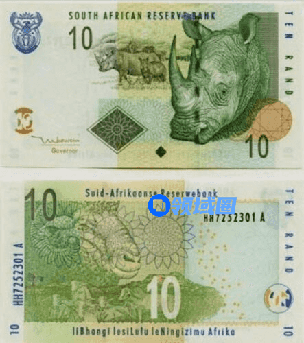 南非10兰特上正面的白犀牛和背面的南非波尔羊”