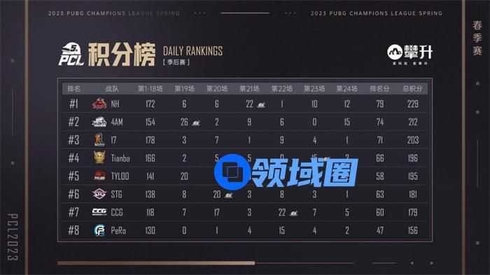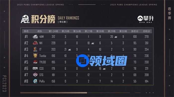 第五比赛日:本日为争冠之日,4AM战队、17战队、NH战队争先恐后,其队伍积分也交替领先,将冠军归属悬念留在了最后一刻。随着第二局CTG战队的吃鸡,17战队以233分排在榜首,仅仅只高出4AM战队两分,而排在第三的NH战队也只是落后17战队4分;同时Tianba战队和TYLOO战队以同样211分队榜首虎视眈眈。而后,4AM战队凭借在倒数第二局的吃鸡成功反超登顶榜首,此时距离夺冠只差临门一脚,好在最后一局的时候,4AM战队以舍我其谁的勇气闯进决赛圈得分,成功超越继承分多他们一倍之余的NH战队和17战队,登顶PCL2023春季赛冠军,可谓是强者造天命!
