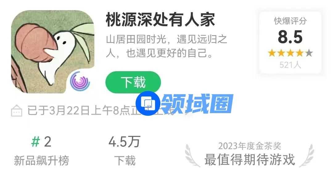 超休闲方面,在国内App Store免费游戏榜单中,腾讯极光计划发行的模拟经营游戏《桃源深处有人家》上线后,空降免费游戏榜首,且至今依然稳坐榜单TOP5.《桃源深处有人家》是一款可爱画风的经营类游戏,该游戏与市面上其他经营产品相较,最大的不同在于,该游戏不仅不肝不氪,还花费了极大的篇幅,给玩家讲故事。清新的画风,细腻的故事脉络让该游戏一上线就斩获了大量玩家的青睐。目前该游戏位于App Store免费游戏榜单第4名,在好游快爆也拿下了新品飙升榜第2名。